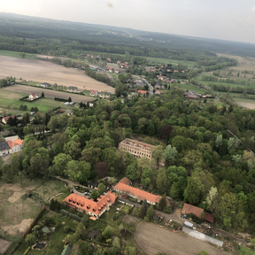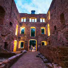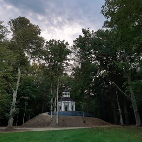 Wenn man in den Osten von der Schlossruine spazieren geht, kann man ein Aussichtsberg mit einer Grotte sehen. Auf seinem Gipfel ist eine schöne Laube (Rosentempel) gelegen. Von dort aus erstreckt sich ein wunderbarer Blick über die Wiese und die Schlossruine. Der Rosentempel ist auch perfekter Ort für romantisches Treffen.
