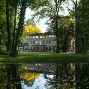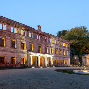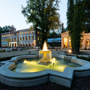 In der Nähe von den Teichen sind zwei wichtigste Parkattraktionen, die Schlossruine und wieder aufgebaute Orangerie. Die Ruine wurde abgesichert und ist jetzt für Besucher zugänglich. In der Orangerie gibt es ein Café, wo Sie sich einen aromatischen Kaffee und einen leckeren Kuchen oder ein Dessert ergötzen können. Im Sommer kann man sich auch im Rankgitter entspannen, das die Orangerie mit dem Schloss verbindet. Wenn Sie auf dem Schlosshof stehen, ist es unmöglich zwei Brunnen zu übersehen. Der repräsentativste ist der Brunnen mit der Nachbildung der Skulptur „Knabe mit dem Schwan”, der vor dem Haupteingang der Residenz steht. In der Umgebung der klassizistischen Orangerie befinden sich noch ein effektvoller Kreuzbrunnen und eine Nachbildung von einem antiken Sarkophag aus dem 3. Jahrhundert u. Z.